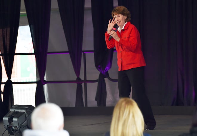 Comedian Jane Condon performs under the RestART tent at Goodwill Theatre’s Schorr Family Firehouse Stage in Johnson City. The recently added tent is the site of live theatre, comedy, and music events. Saturday, May 15, 2021. Kate Collins/ Binghamton Press & Sun-Bulletin.